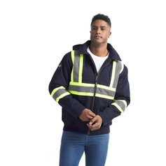 - 4” hi-vis contrast band with 2” reflective tape on front and back body and sleeves.